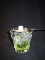 アブサングラスにアブサンを注ぎ、アブサンスプーンの上に角砂糖を乗せます。
